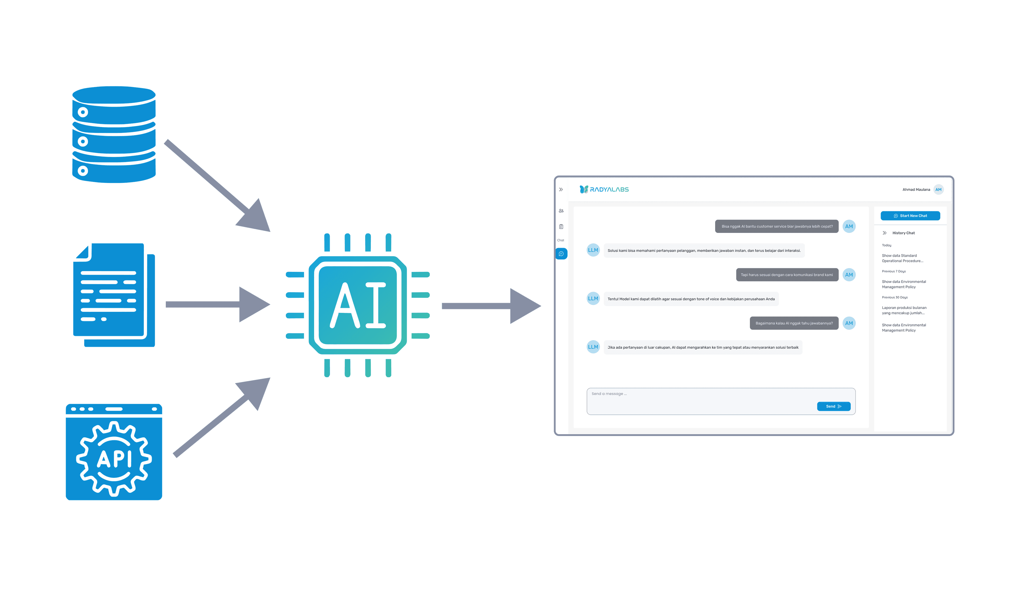 Trained on your enterprise knowledge base, internal documents, databases, and workflows.